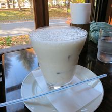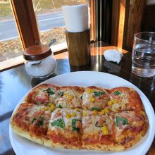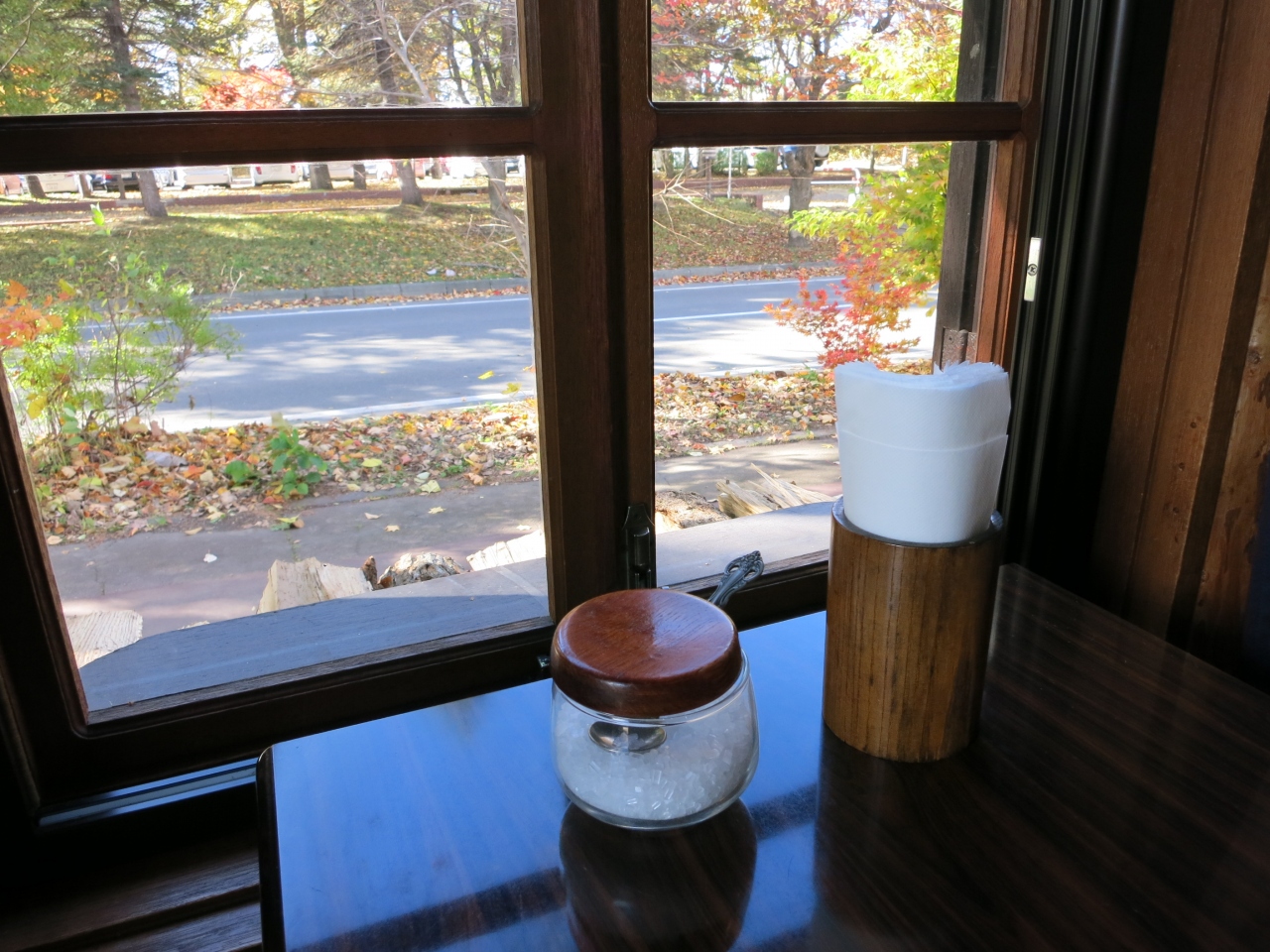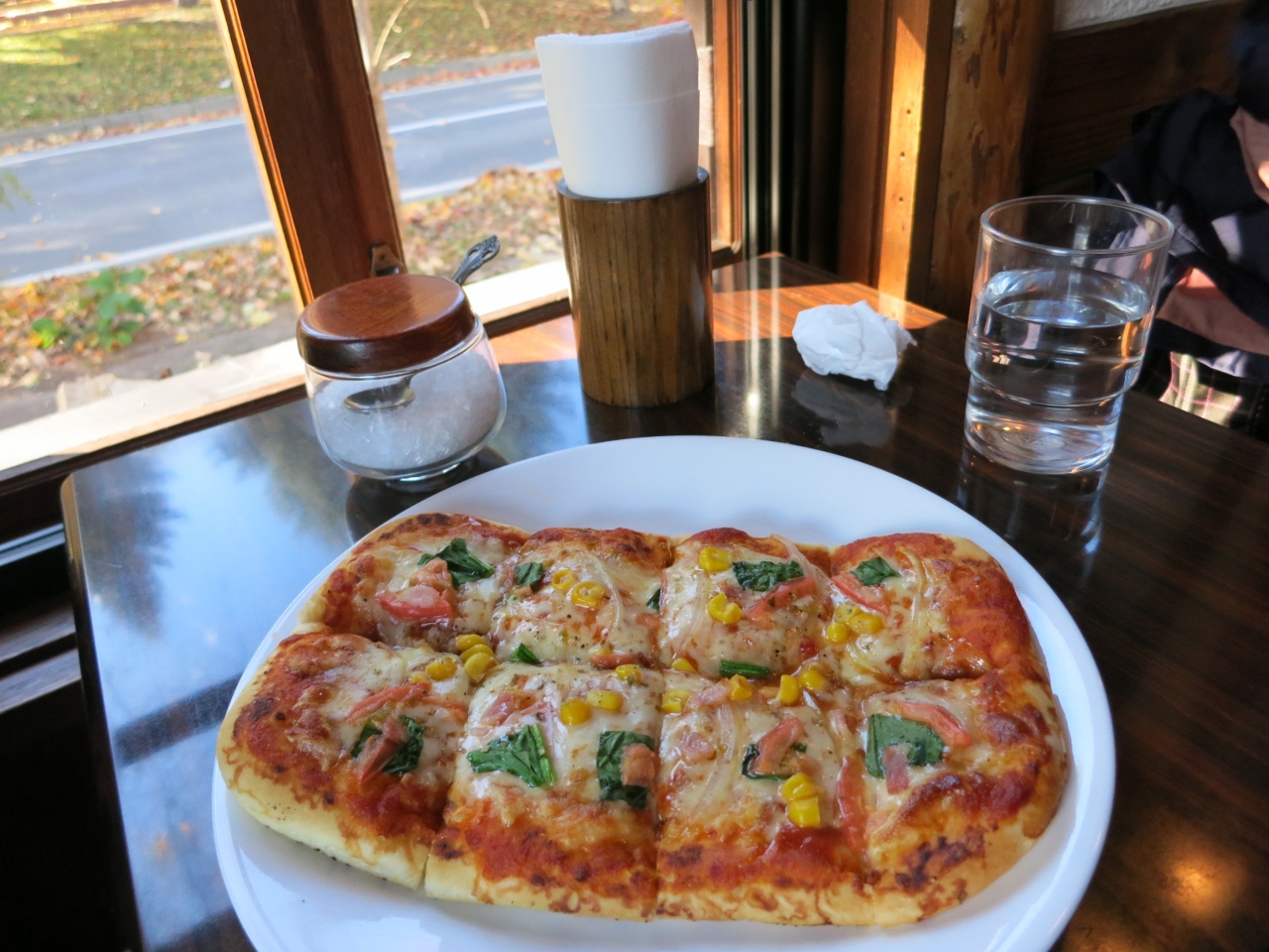 ピザは焼きたてなので少々時間がかかりました。ただ、バナナジュースなどを飲んで外の景色を眺めながら話していると、すぐ時が経ってしまいます。トテッポ通りに面していて、黄や赤の紅葉が窓越しにきれいでした。よく晴れた秋空のまぶしい日の光を受け、鮮やかに輝いていました。