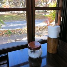 紅葉鮮やかなトテッポ通りを眺める食卓。アンチョビのピザが美味しかった。