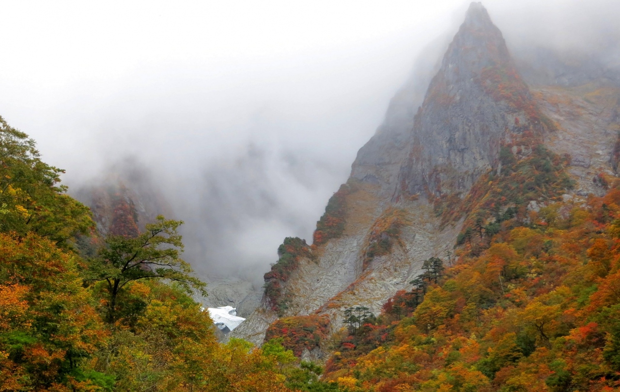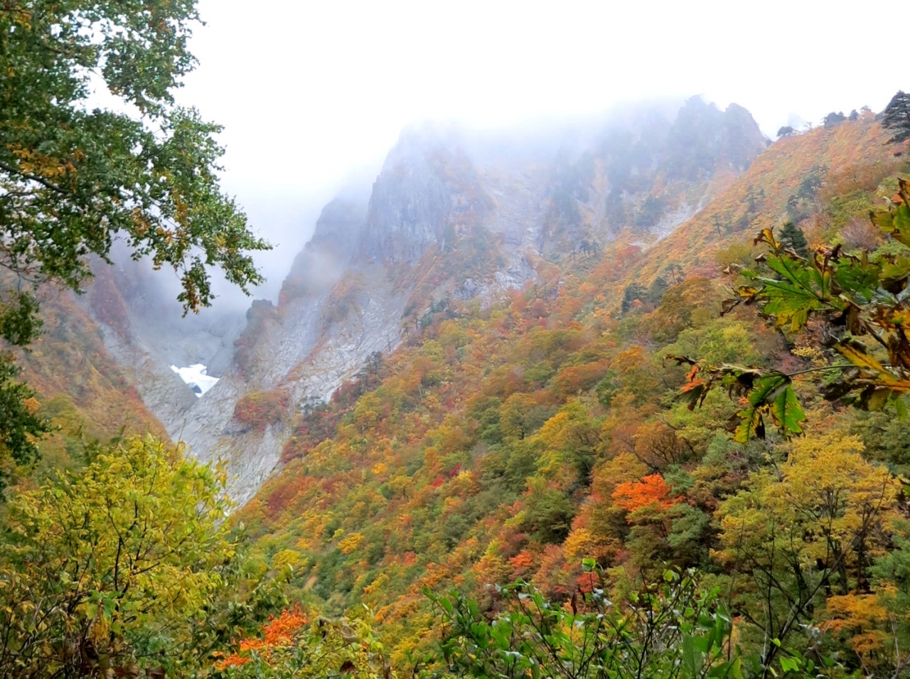 紅葉の木々のバックには雪渓とうっすらと雪を
