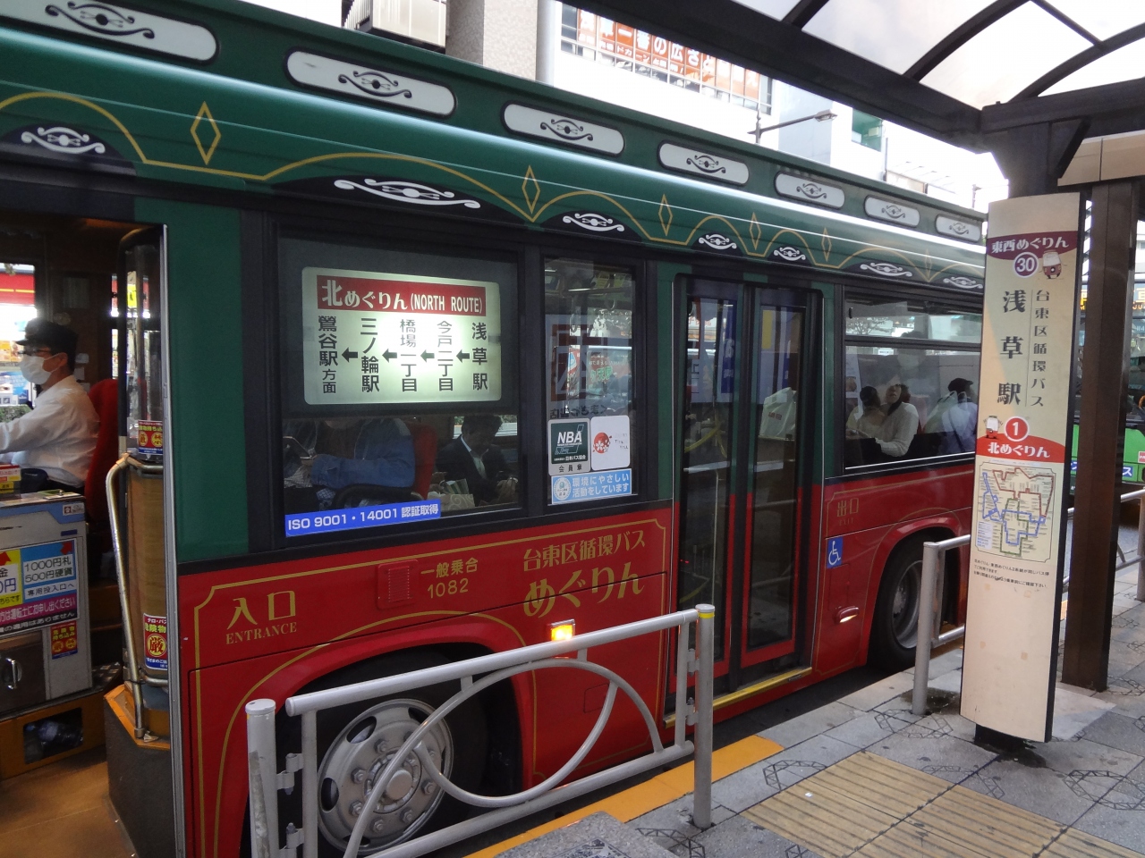 台東区内を走るコミュニティバスです。北、南、東西など何路線かあるようですが、運賃はいずれも100円とお安いです。バスは車両が小さく、従っていつも混んでいて、なかなか座れません。外観の塗装に特徴があり、走っていてとても目立ってました。