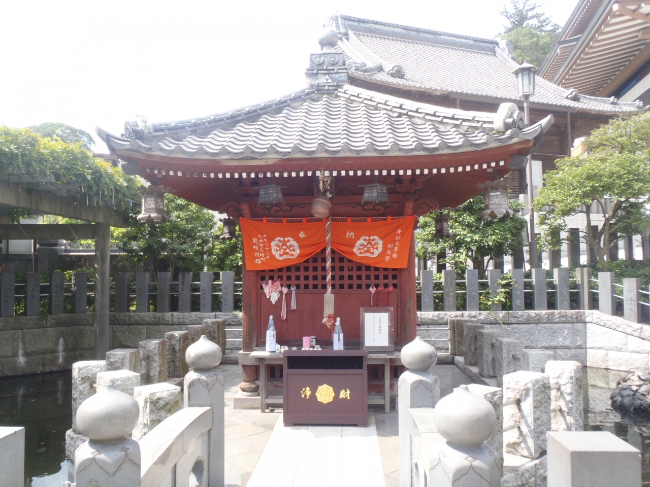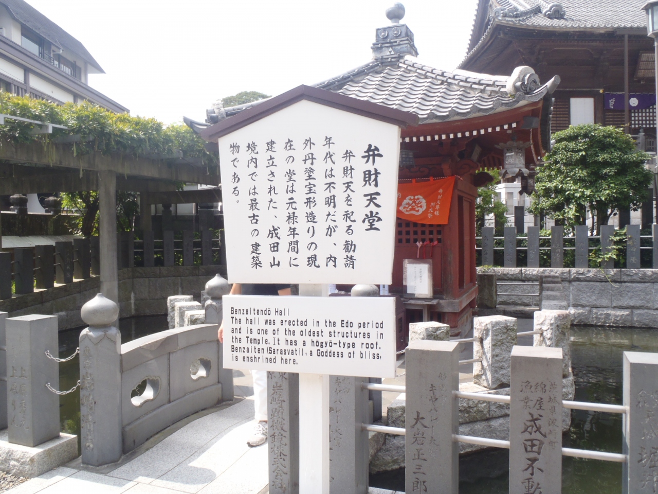 弁財天堂は堂庭の西隅にある池の中の小島に建てられた1.8m四方のお堂で、現在のものは元禄年間に建立られており、成田山において最も古い建造物の一つに数えられています。
