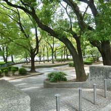 天満橋駅より大川を渡った北側に位置します。「天満青物市場跡」や「淀川三十石舟唄碑」などが残る公園です。また、テニスコートがありテニスをしている方もおられました。散歩する人、河川を眺めている人、庶民の憩いの場所ですね。