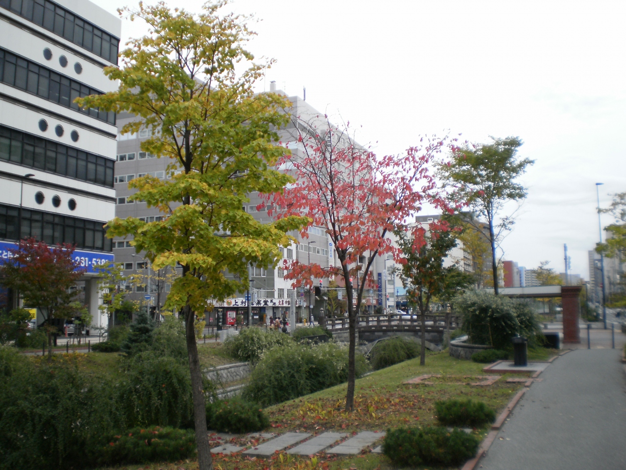 札幌の創成川公園は創成川の流れに沿って造られた細長い公園です。 遊歩道が整備されていて、一部に札幌の歴史を感じられるところもあって、復元された橋や札幌建設の地碑のモニュメントがあります。 ここを散策していると、10月も下旬になり樹木の葉が紅葉してちょっといい雰囲気になっていました。