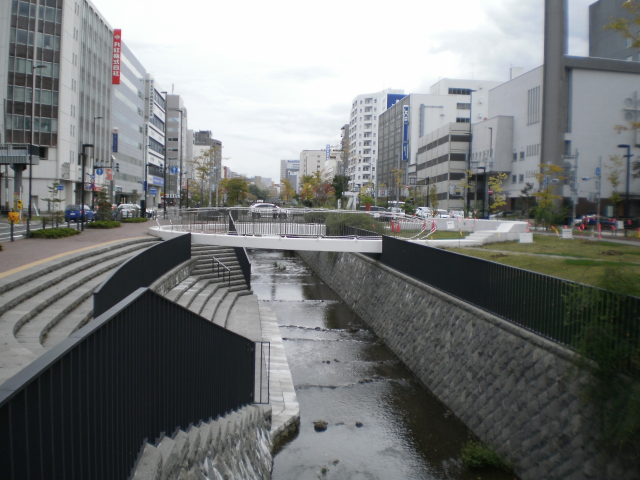 札幌のテレビ塔の下、大通り公園の反対側に屋外美術作品のスノーリングが、創成川の上に置かれています。 札幌の東西南北を分けるある意味札幌の中心なのだそうです。 スノーリングの上には手すりがついていて橋のようにあるくことができる珍しいオブジェです。