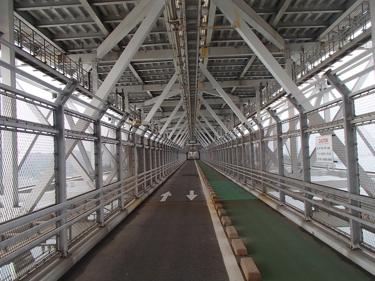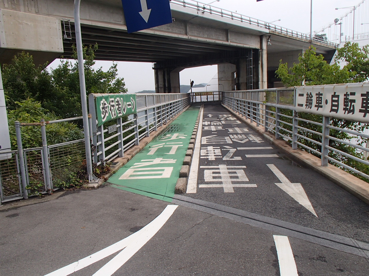 しまなみ海道 (しまなみかいどう)の因島大橋の区間では、歩行者と自転車、二輪車との区画分けがしっかりされていて、間には縁石まで置いてもらっているので、歩行者への配慮が充分できています。橋下も雨風をしのげるそんな構造です。ぜひ、一度