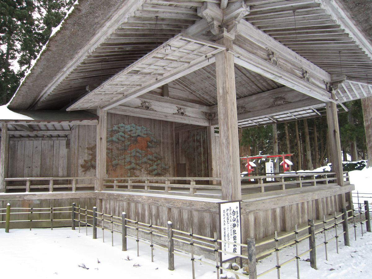 その中尊寺の守り神である白山神社。加賀の白山が由来とのことですが、ここには東日本で唯一の能舞台の遺構があります。雨ざらしで痛みがありますが、重要文化財に登録されています。中尊寺の境内から少し外れたところにありますが、ぜひ一見をおすすめします。