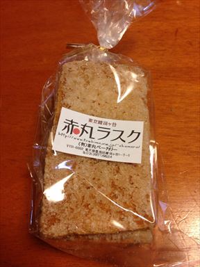 赤丸ベーカリーのラスクです。砂糖が意外にタップリで、ブラックコーヒやアールグレイ紅茶と一緒に食べると、とてもおいしくいただけます。ラスクには、たっぷりの砂糖が付いてますが、ぜひ、一度、食べてみてください。