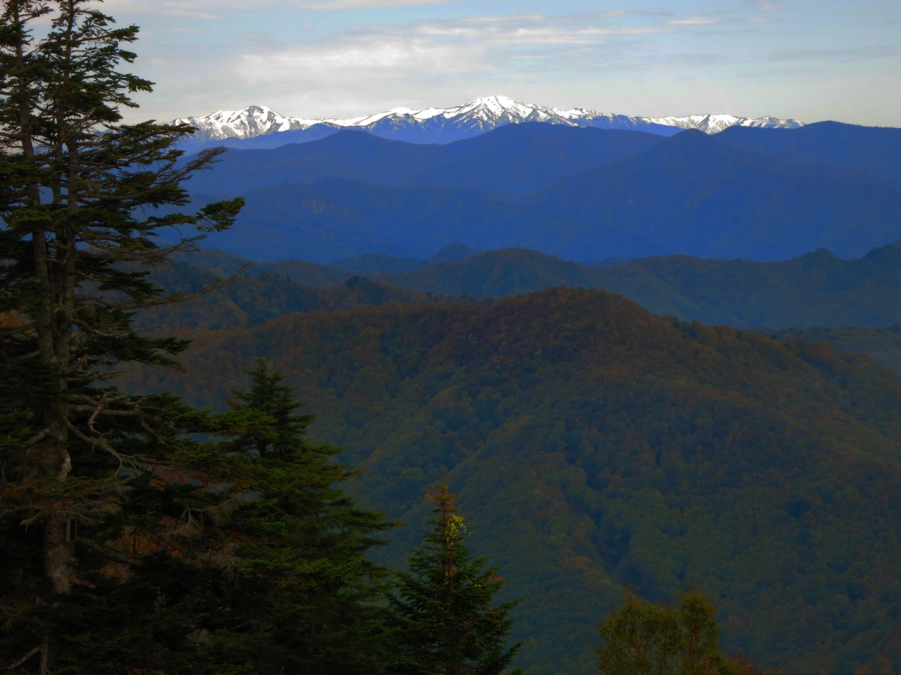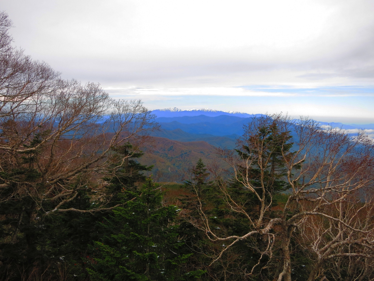 白布温泉からロープウェイで天元台高原に上がると、上ってきたロープウェイの方向に見える山並みの奥に、白雪を覆った飯豊山(連峰)が望めました。上空は曇っていたのですが、飯豊山の上は薄い青空で、眼下の紅葉と飯豊山が印象的でした。晴れていればもっと良いのでしょうけど。