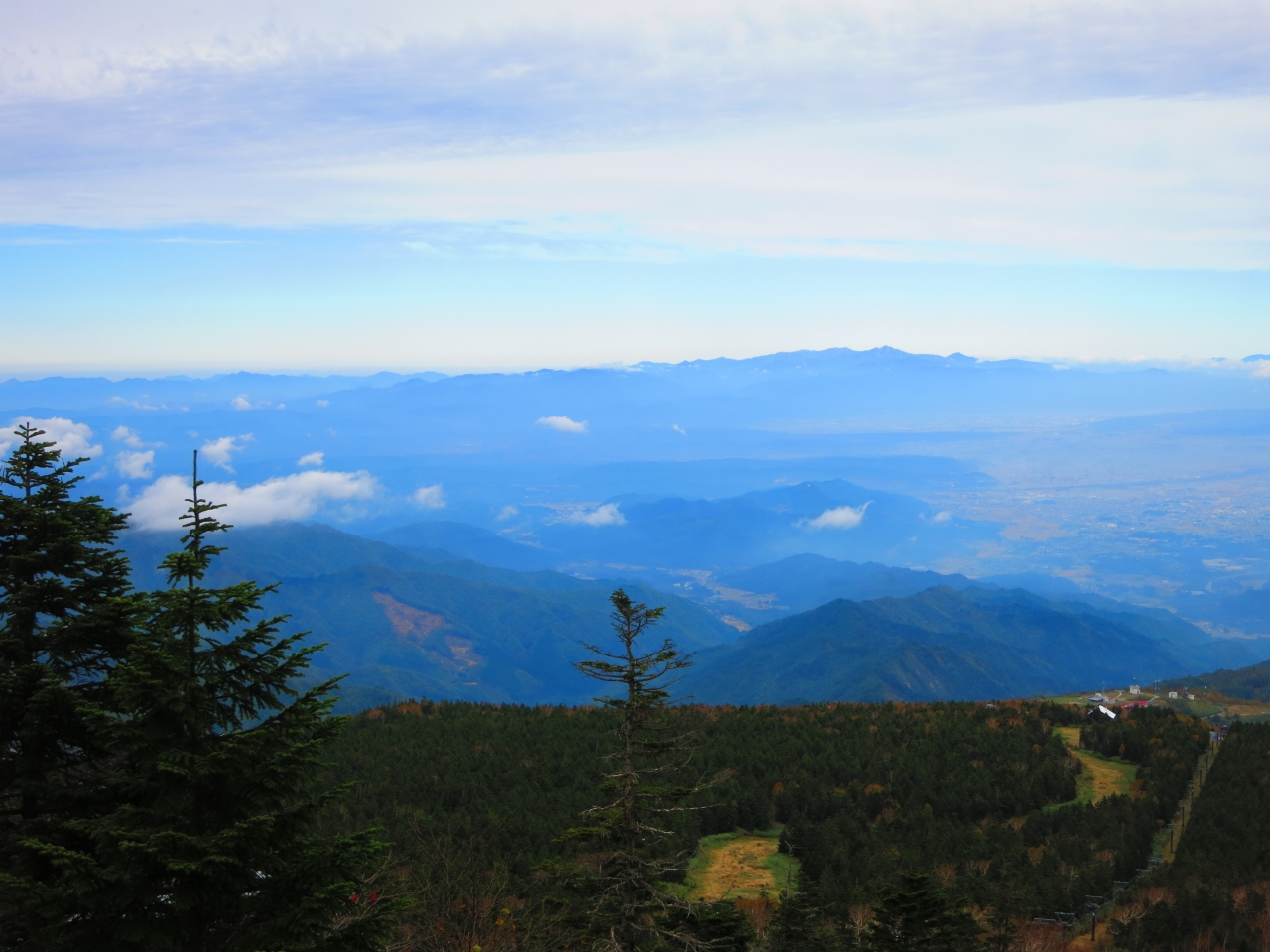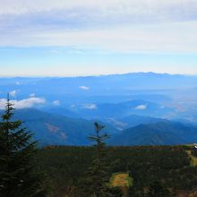 白布温泉からロープウェイ天元台高原に上りさらに、しらかばリフトに乗り継いでリフトを降りると、上ってきたリフトの後方に、米沢、長井のある置賜盆地が広がり、その奥に朝日岳(朝日連峰)の遠望が見られます。快晴の日だとさらにはっきりと見えたると思います。