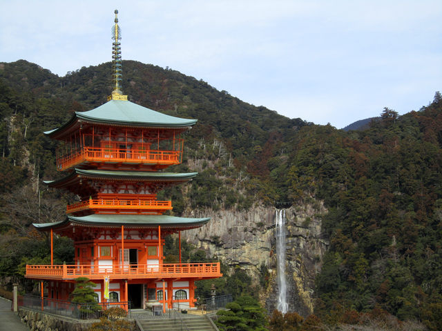 重要文化財に指定されている本堂もさることながら、那智大滝を背景にそびえたつ三重塔も素晴らしいです。