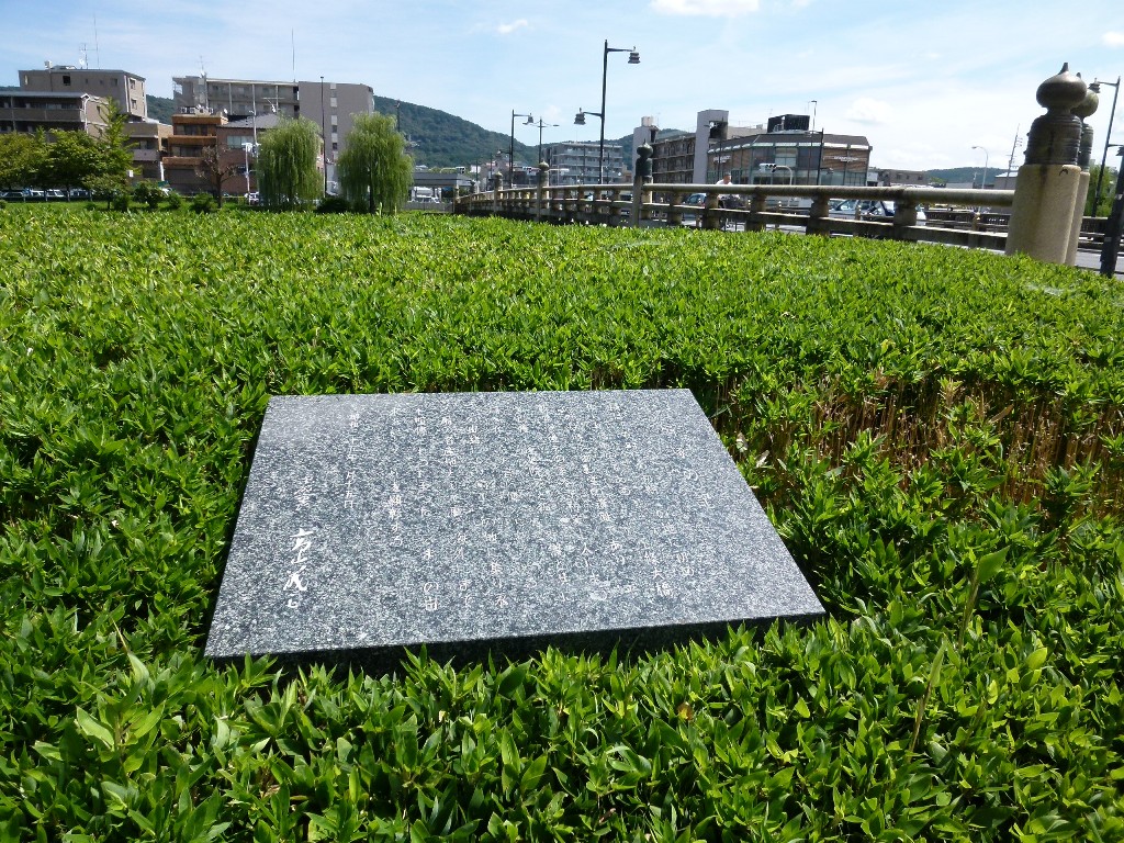 牛若丸と弁慶が出会ったと言われる鴨川に架かる五条大橋。この橋の横にあったのが扇塚のオブジェ。このオブジェは御影石で出来ています。奈良・平安時代からある扇(扇子)は、ここ京都扇塚が発祥の地のようです。今でこそ男女問わず扇子を使うようになりましたが、20年以上前に京都老舗店で購入した扇子は宝物となりました。