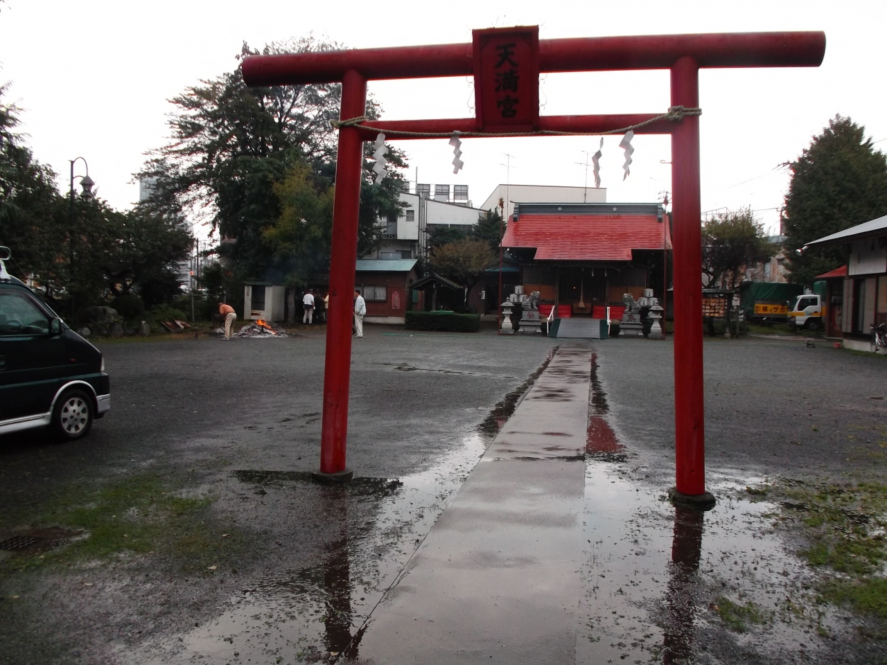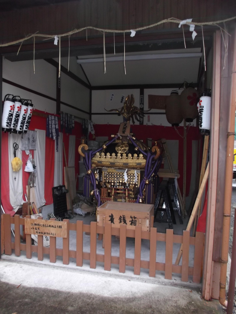 訪ねたこの日、氏子衆が清掃焚き火をしていました。時期柄七五三行事の準備なのでしょうか、またお神輿が公開されていましたのでお参り拝観しました(写真)。