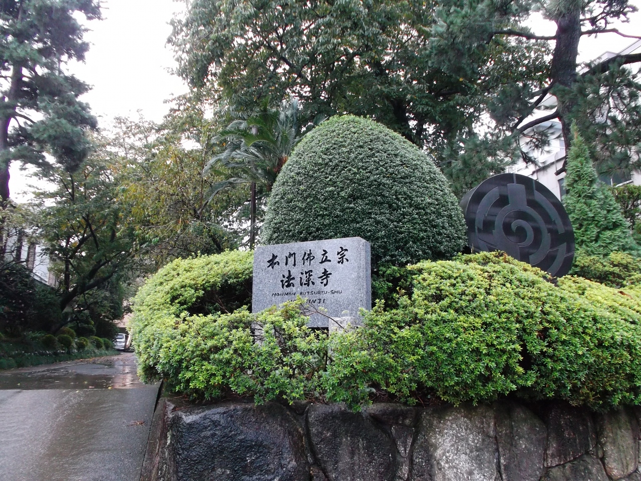 小田急・相鉄線大和駅から中央4丁目交差点過ぎた付近に整った植林と石碑がります。ここが本門仏立宗の清照山法深寺の入口にあたります。中に入ると駐車場、その奥が寺院です。会館のような造りで外に日博上人と刻まれた胸像が建てられています。日蓮聖人の教えを伝えているようです(間違っていましたらご容赦を)。