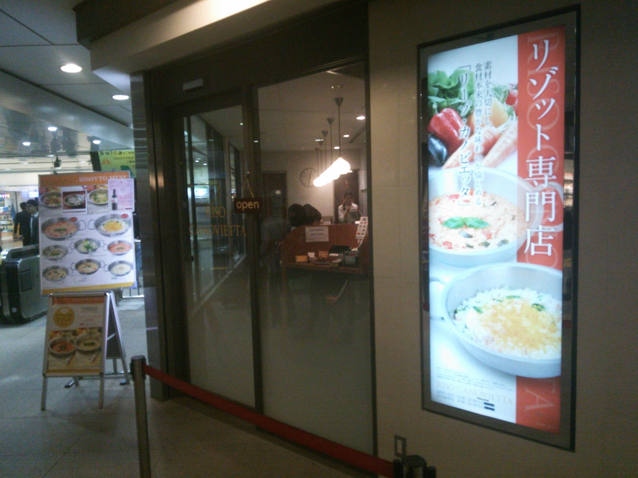 東京駅八重洲地下中央改札の内側の右手、改札のすぐ隣にあります。お昼時は、そとに多い時で10人くらいならんでいます。わたしは、早めのお昼、遅めのお昼のときに利用します。食事は1000円以内で、和洋いろいろなリゾットがあります。味もとてもおいしいです