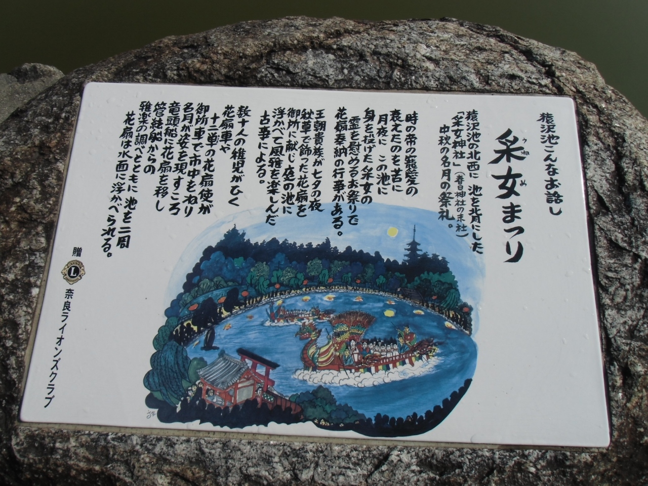近鉄奈良駅からのんびり歩いて約10分のところにあります。この池の淵から興福寺の五重塔を眺めると、手前の柳、猿沢池に映った五重塔、緑の中にそびえる五重塔が美しく見えます。この池には数多くの伝説が伝えられています。池の周りに伝説の一部が紹介されています。