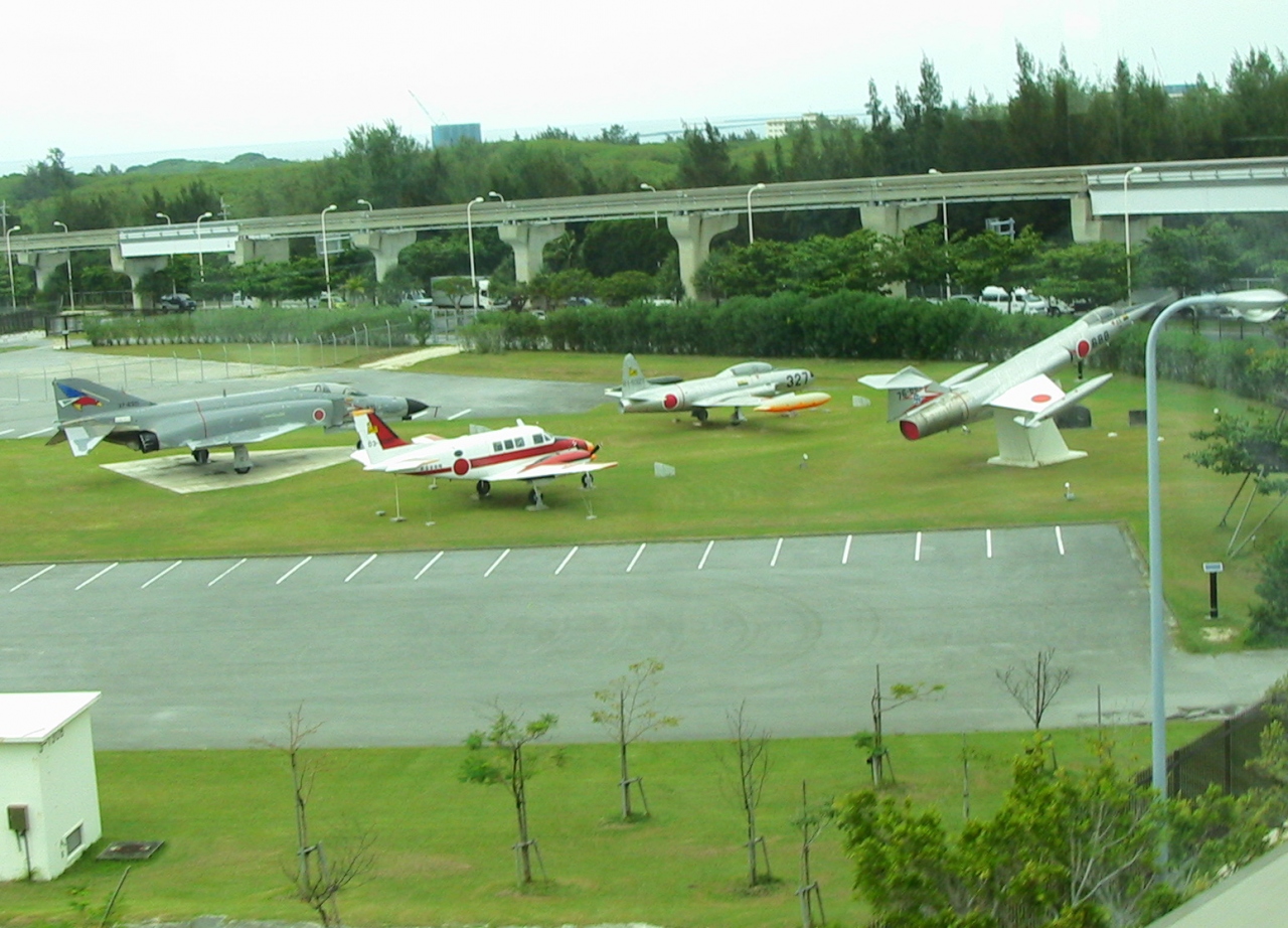 沖縄の玄関である那覇空港は、民間航空機の発着する空港であるとともに、自衛隊も利用する空港となっています。このため自衛隊の基地もおかれていますが、この基地のゆいレールから見えるところには、航空機が何機か展示されています。ゆいレールに乗ったときにはぜひご覧になってください。
