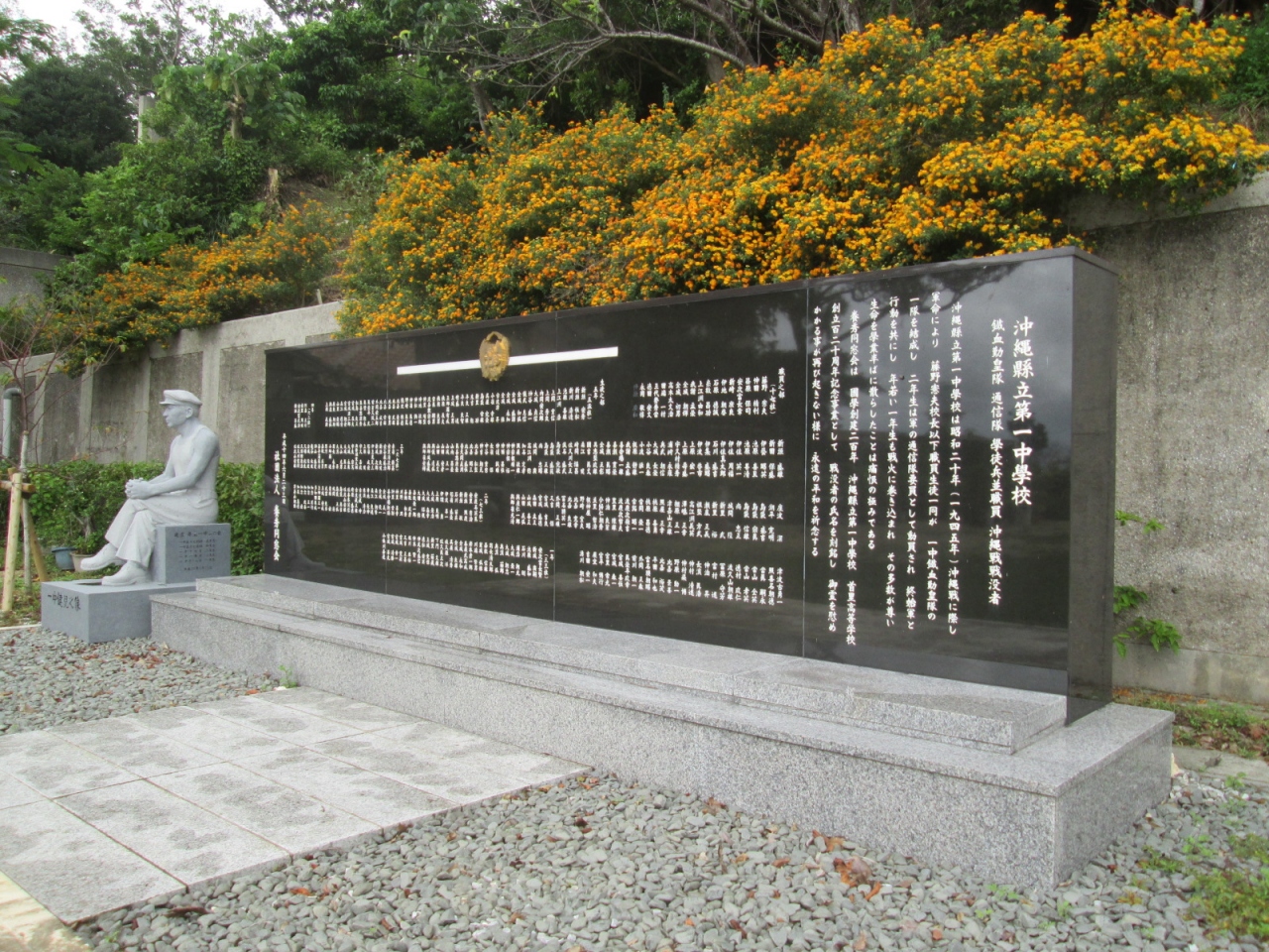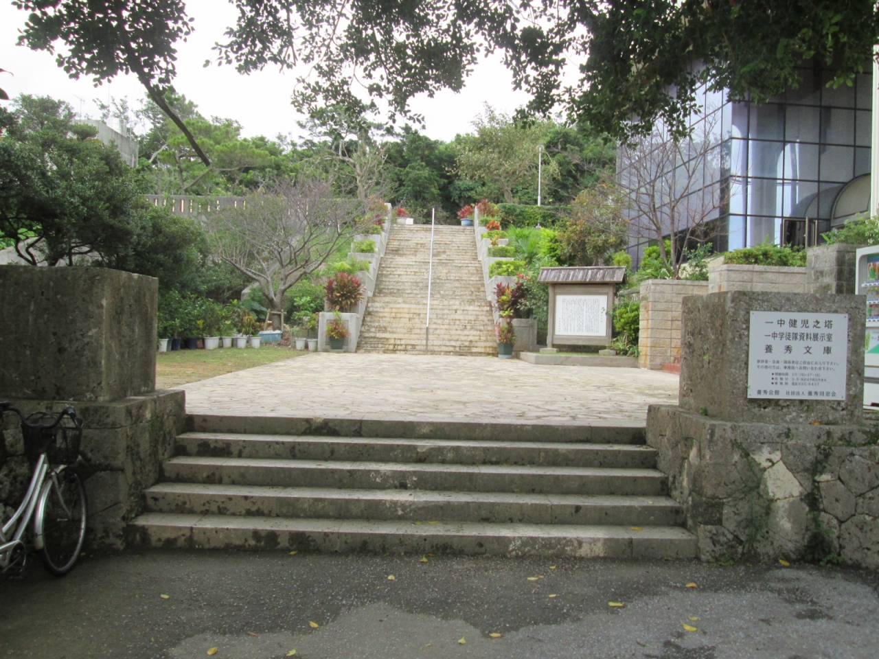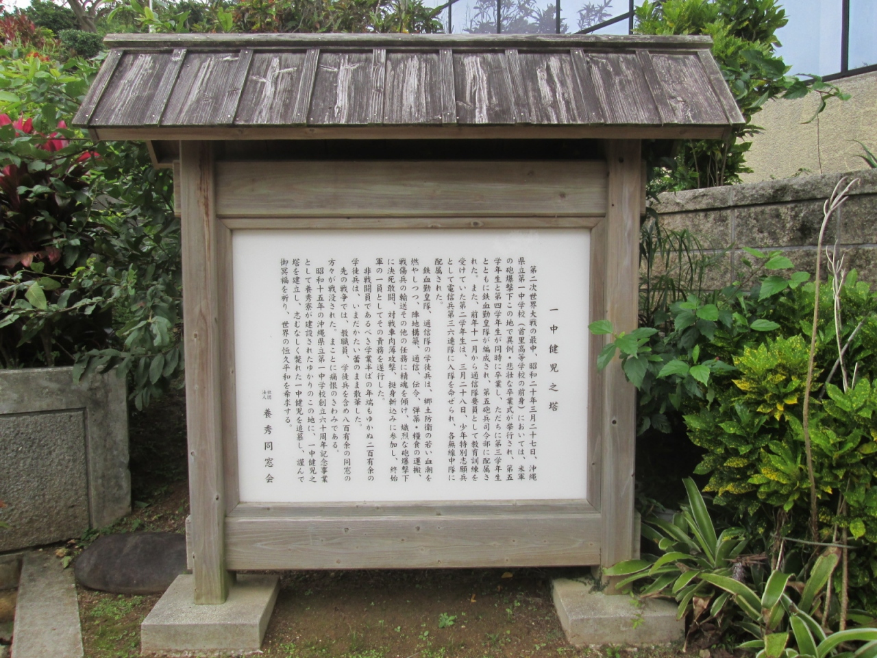 沖縄戦当時、旧制県立第一中学校(現首里高等学校)の生徒たちが鉄血勤皇隊や通信隊学徒兵として組織され、200名以上が戦死しました。また一中同窓生の方では教職員、学徒兵含めて800名以上の方が犠牲になられたということです。これらの方々を祀るため、かつて一中の養秀寮があった場所に建てられたのが、この「一中健児之塔」です。国策の犠牲者となった多くの若者に、改めて弔意を示したいと思いました。