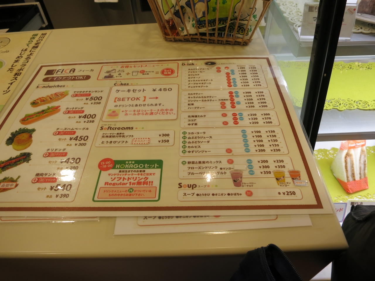 旭川駅構内に入っているカフェです。旭川駅利用者には、雨などにも濡れず、改札からすぐという利点があります。メニューはサンドイッチやケーキなどのスイーツ、コーヒーやジュースなどの飲み物と軽食しかありませんが、行った時はトマトの健康カレー(\500円)やエビピラフ(¥500円)もやっていました。店内は15名ほどしか座れるスペースはありませんが、サンドイッチや飲み物はテイクアウトできるとのことです。ウインドウにケーキなどのスイーツを出しているのが目立つせいか、店内は女性客が多かったです。