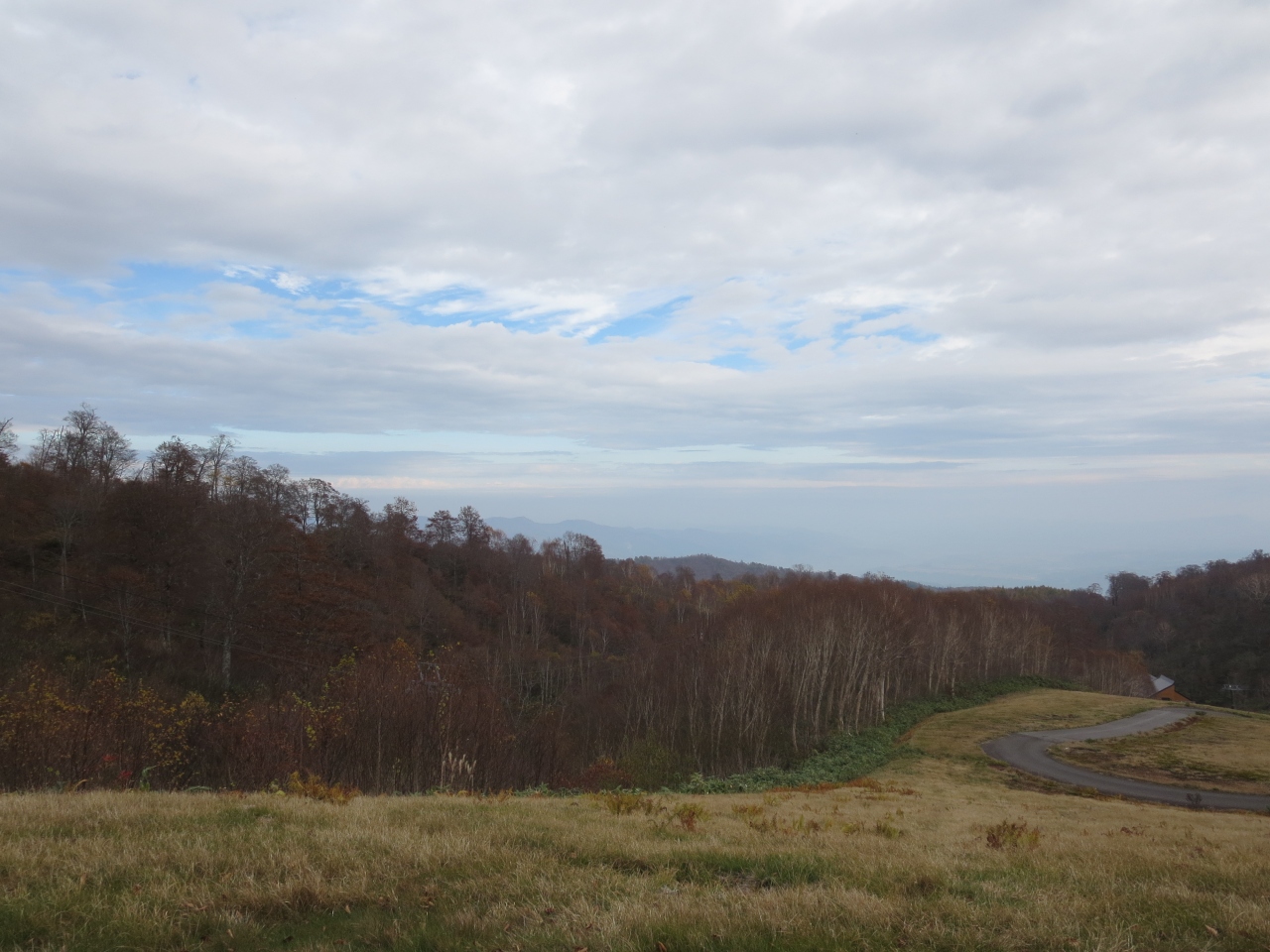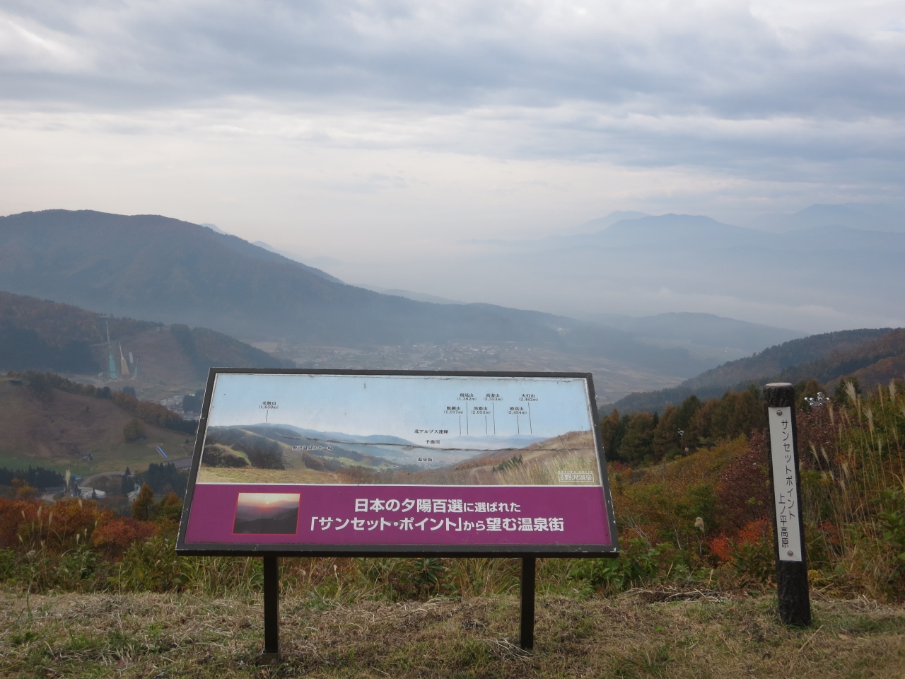 雪のない野沢温泉スキー場、車で山を登る途中に、日本の夜景100選に選ばれた場所がありました。午前中でしたが、きれいな景色が楽しむことができます。「菜の花畑に・・・」の舞台となった野沢温泉村一望の絶景ポイントです。スキーをする方でも、雪のないゲレンデ、面白いかもしれません。