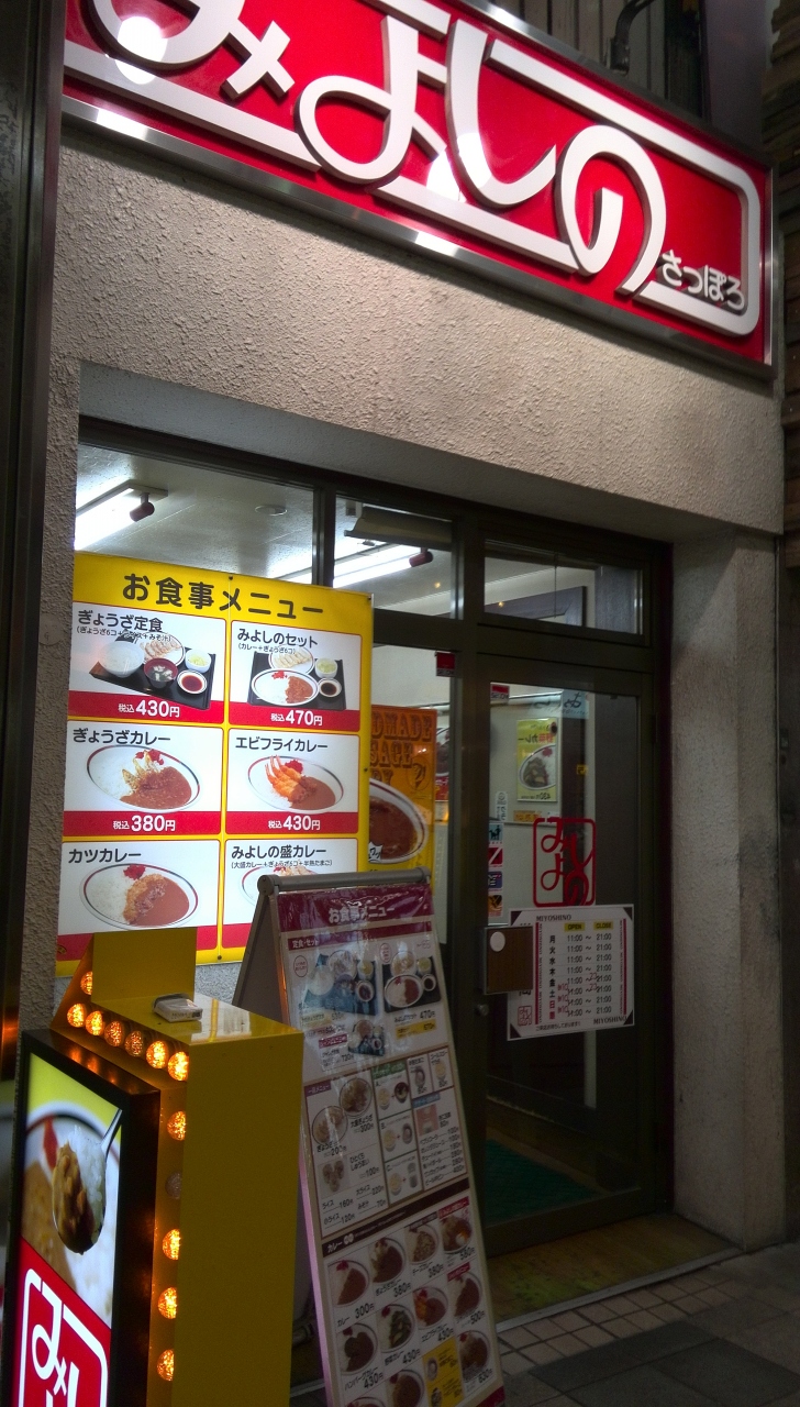 みよしのは、リーズナブルな、餃子の専門店だ。注文後、結構早めに出てくる。ファストフード的な感覚の店だ。餃子に、ライスや味噌汁の付いたセットを注文する人が多いだろう。ワンコイン以下で食べれる感じだ。カレーも結構ウマイので、カレーライス付きみよしのセット470円もお勧めだ。