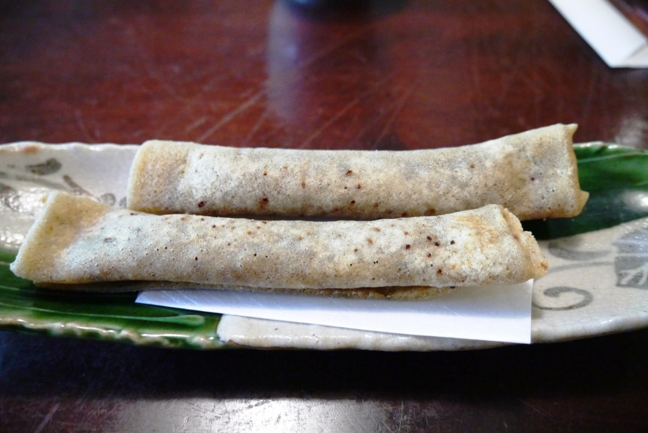 信濃の具材をそば粉で包み込んだ「みそ包み揚げ(一包230円)もあっさりとしていて美味しかったです。