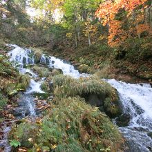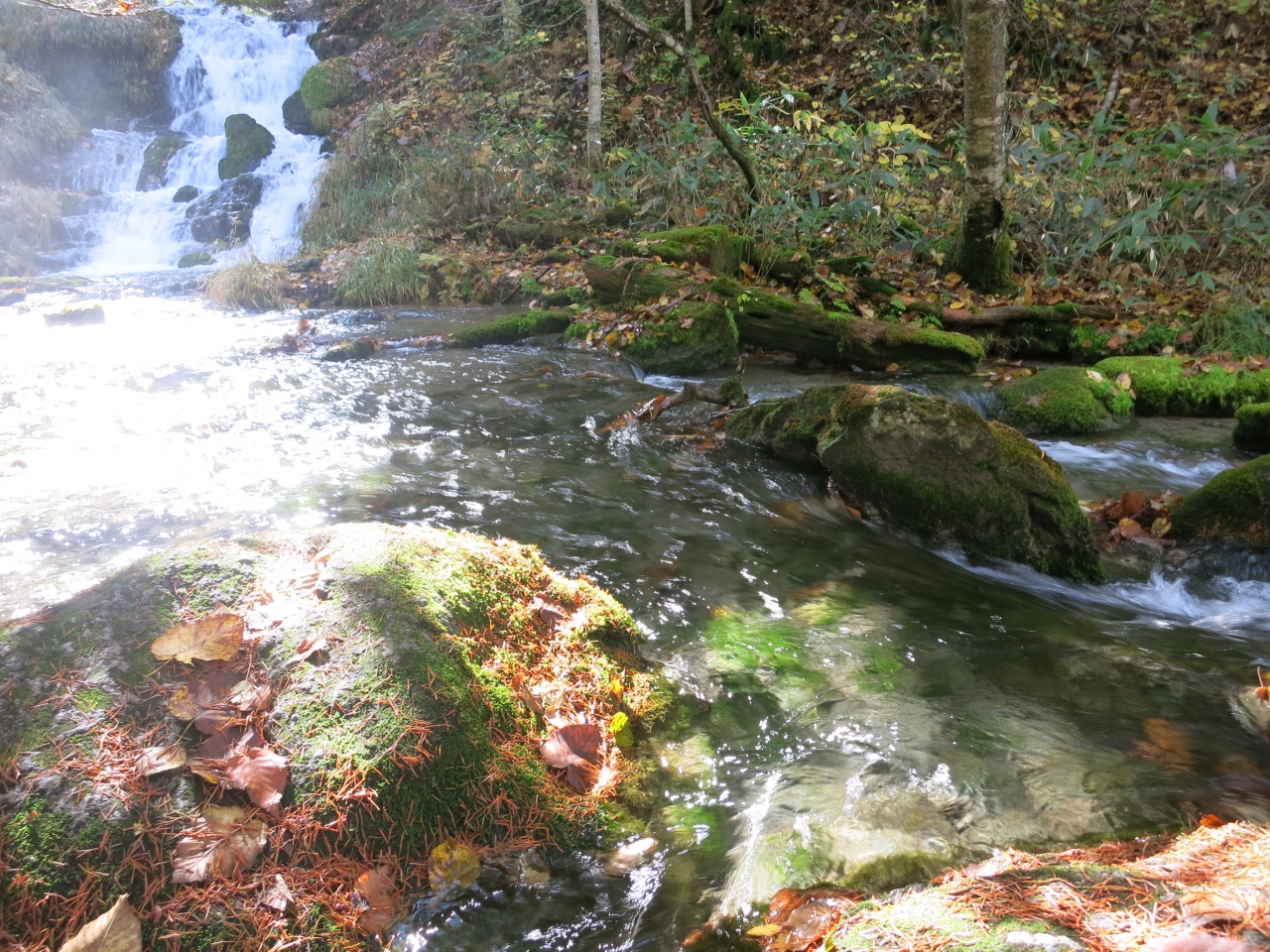 休日だったので、あいも変わらず青い池の方は朝から人と車でいっぱいでしたが、不動の滝の方は数人が立ち寄る程度。行者の方々が数人で法要をしていたこともあり、さびしい感じはありませんでした。むしろ、朝日の差し込む森の中を滝と清流が流れ、紅葉の中、マイナスイオンを含んだ風が清清しく、凛とした清流の冷たい水に手をつけていると日常のストレスが洗い流されていくようでした。