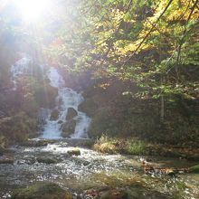 朝の清新な光の中、流れ落ちる滝と清流がよかった。ストレス解消、マイナスイオン吸収!
