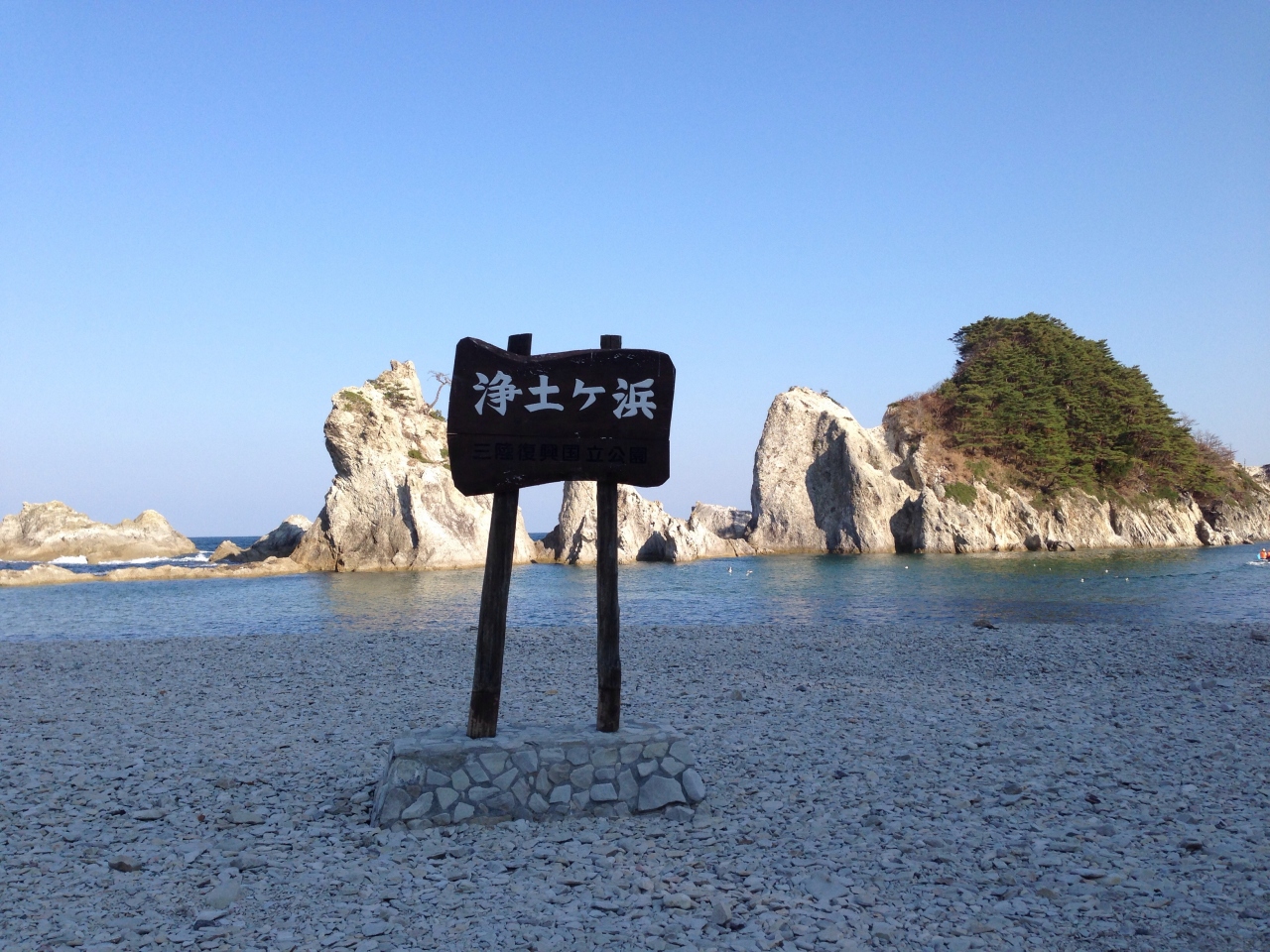 震災後、初の訪問でした。浄土ヶ浜の看板は以前のものを再利用しているようでした。晴れていたので、青空と海、島、海岸の石などなど、写真で撮ってみてどれも綺麗に撮れた気がします。遊覧船も出ていました。万一、地震が来てもすぐそばに上り坂があるので大丈夫!安心して観光できそうです。