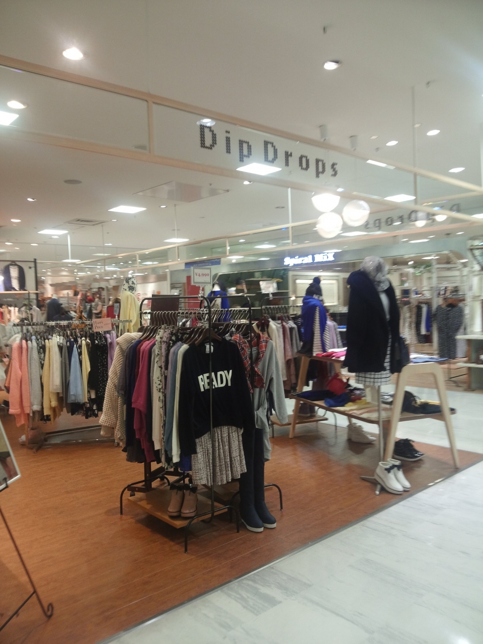 ディップドロップスは、トレンドとオリジナリティーを意識する女性に向けた カジュアルブランドです。オンワードグループのショップです。ショップ内は、明るい色から地味な物までレーデス向けに幅広く揃っていました。