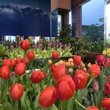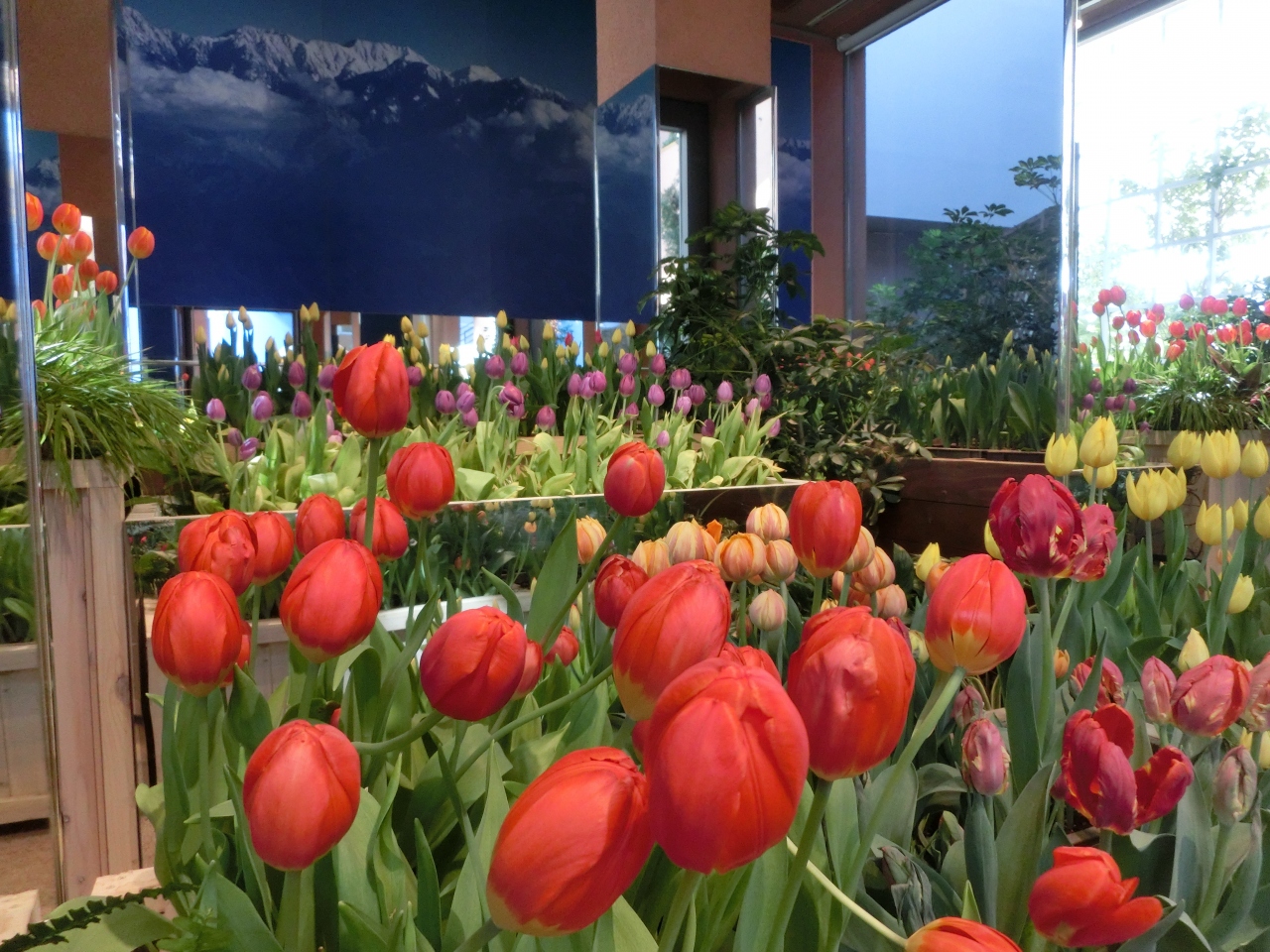 さらに奥に温室があって、一年中チューリップを見ることができますが、鏡の効果でたくさん映っていることもあり、チューリップ面積そのものは狭いです。。