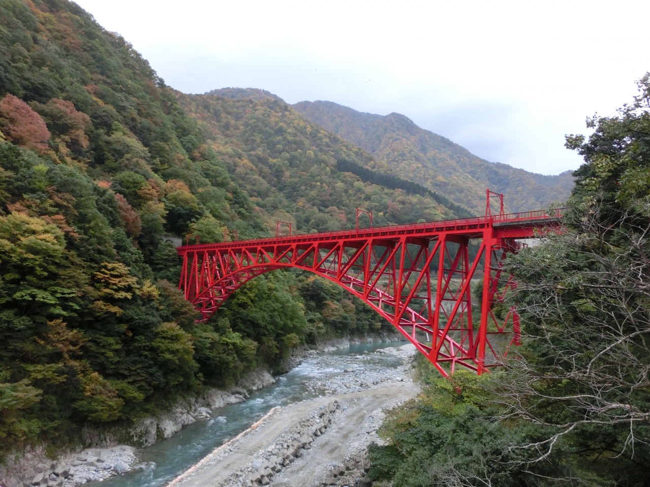 赤い橋と青い河、緑色(秋は紅葉)の山々がほんとうに美しいバランスです。