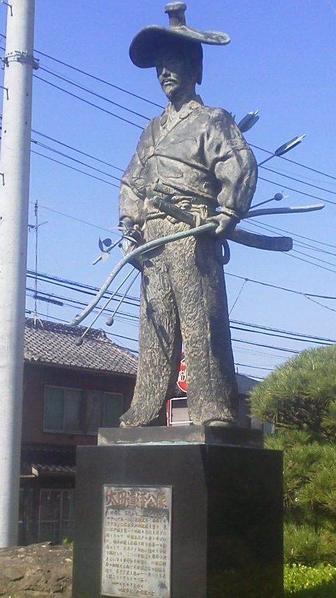 川越市役所のまさに目の前の角に君臨しているのが太田道灌(おおたどうかん)の像であり、しっかりと街を見据えて建てられています。なんでも太田道灌氏は武蔵、相模の有力者であり、ここの川越城を築城した人だそうで、しかも、江戸城も築城した人ということで、しっかり歴史に名前を刻んだ方ですね。その地元の英雄がこの市役所前から川越の街を眺めていますね。