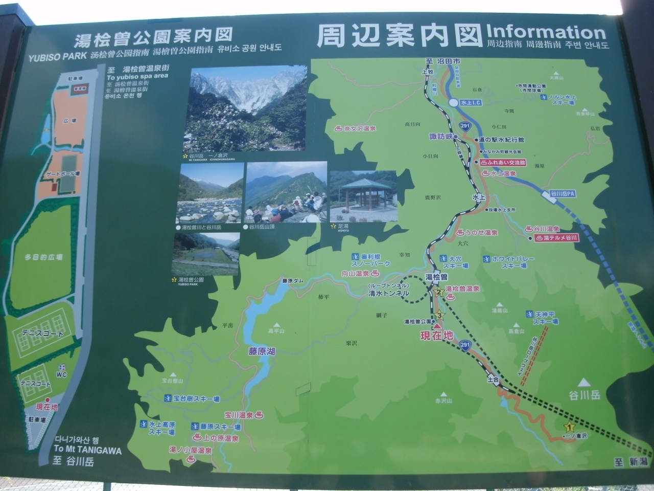 「湯檜曽公園」は、水上温泉郷から国道291号線を北に車で10分ほど、湯檜曽川沿いにある公園です。正面には谷川連峰が見え、周辺の景観は大変綺麗なところです。テニスコート(有料)やサッカー場(有料)、キャンプ場(有料)などが整備されています。公園は無料ですし、トイレや駐車場もあるので、散策するのに良いところだと思います。