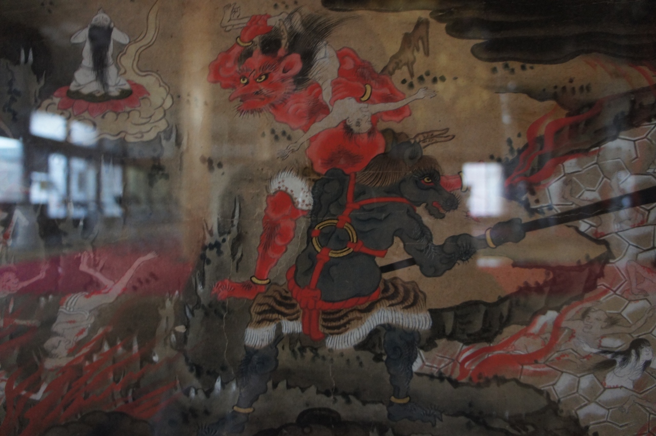 雲祥院は、太宰治ゆかりの寺。太宰治は、生まれてすぐに乳母タケに育てられますが、そのタケの家の菩提寺。太宰はここによく連れてこられたりするのですが、この寺の地獄絵図「十王曼荼羅」も見せられ、道徳観を養ったともされます。絵は本堂に展示されていて、拝観可能。とても鮮やかな色彩で、緻密な描写。迫力もあります。