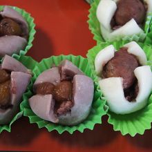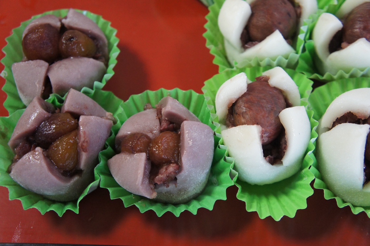 福知山市内の散策をしていて、ちょっと寄ってみた和菓子屋さんです。入って目についたのは、ぶどう大福。しかし、このぶどう大福は強烈なインパクト。十文字に切ったお餅から、中のぶどうの粒がむき出しになっているんです。そして、お餅もぶどう色。ぶどうジュースを練り込んであるんだそうです。いただくと、ちょっと酸味のあるお餅に、甘いぶどうの粒のうまみが迫ってきて、これはうまい、うまい、うまい。ぶどうの粒があふれるくらいなら、切った方が安定するし、理に適っています。ぶどうを使ったお菓子は近くの高校生のアイデアのようですが、これをここまで仕上げたこのお店の創造力に敬意を表したいと思います。