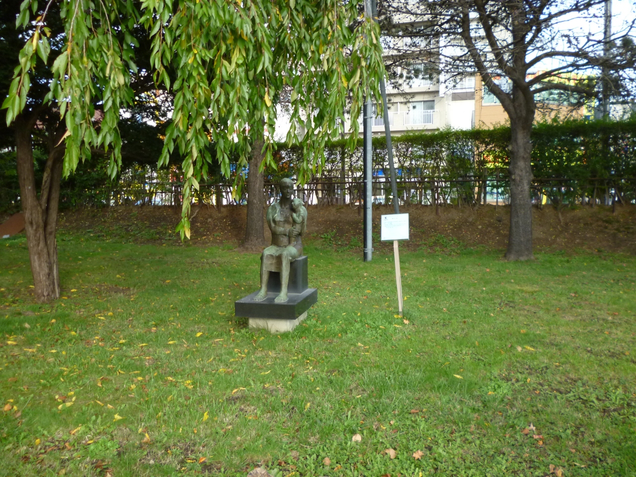 北大病院の入り口すぐ横にあります。母親の像の腕や手は女性としては太く大きく力強い表現になっています。母親が抱いている子供に注ぐ顔の表情は、いとおしい思いが出ています。この像に気づく人は少ないのそうです。
