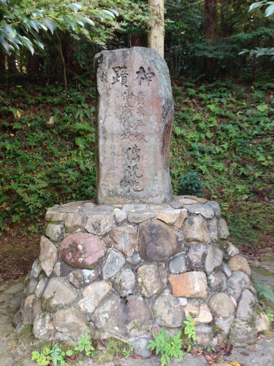 黄泉比良坂のあの世とこの世の境にある大きな石のすぐ横にある、黄泉比良坂と刻まれた石碑です。この石や石碑、石門は薄暗い森にかこまれているので雰囲気があります。