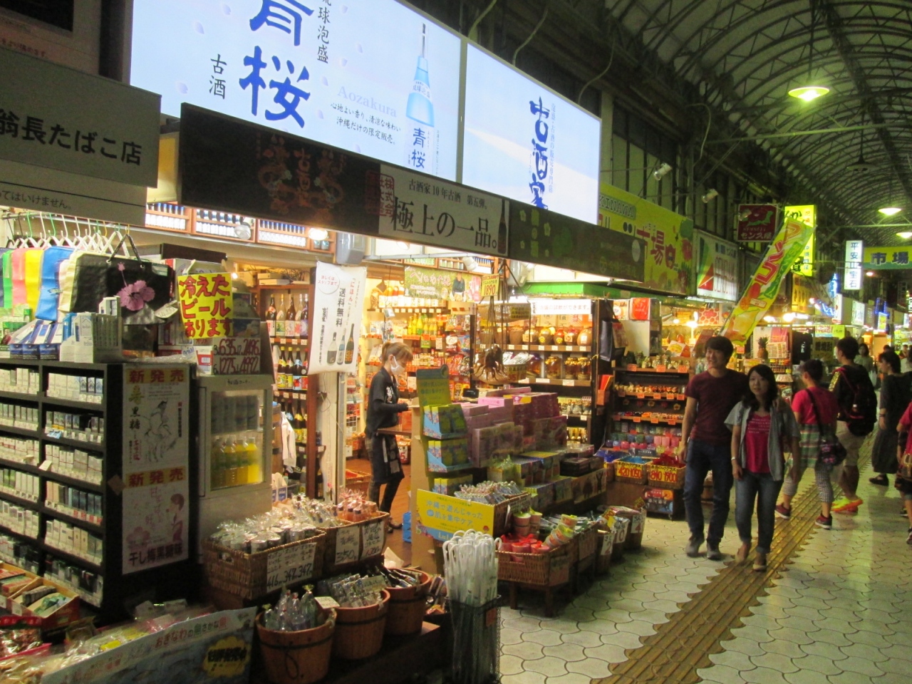 近くの「平和通り商店街」は中高修学旅行生向きのチープな土産物店中心の商店街でしたが、この「市場本通り」は違いました。酒店、民芸品店はもちろん、地元食材が手に入るスーパーマーケット、”きびジュース”を売る店など、大人の商店街で楽しく散策できました。