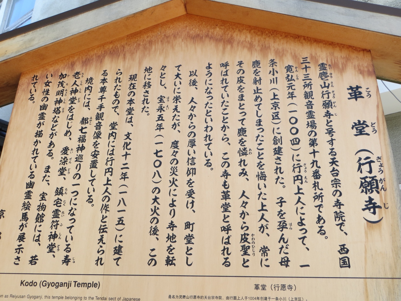 丸太町通から南へ寺町通を下り少し歩いた左側(東側)に通称革堂(「こうどう」と読みます)があります。天台宗の寺院観音霊場の札所で境内には多くの巡礼の人がお参りするそうです。山門から正面にとても立派な本堂があります。歴史を感じさせる場所です。
