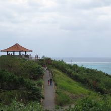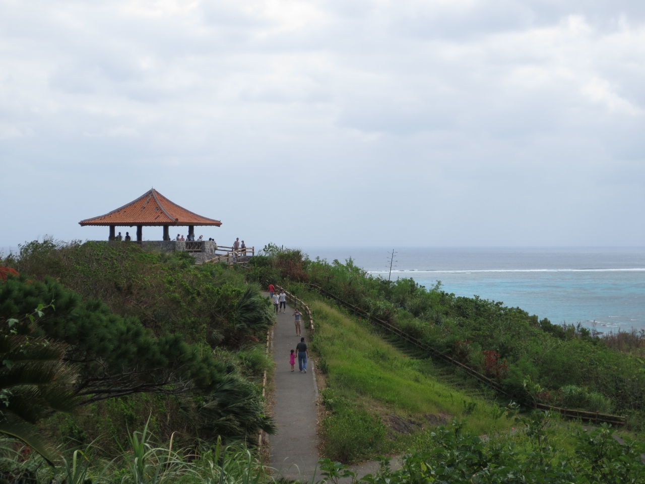 沖縄の海が眺められるスポットです。写真をとるときは展望台の屋根から少し離れて展望台を手に乗せるような形で写真を撮ったりしました。滞在時間は10分程度で足ります