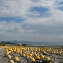 熊野灘の荒波に磨かれた小石が敷き詰められた広い浜辺に魚網の浮き玉らしきものを干している光景が面白かった。