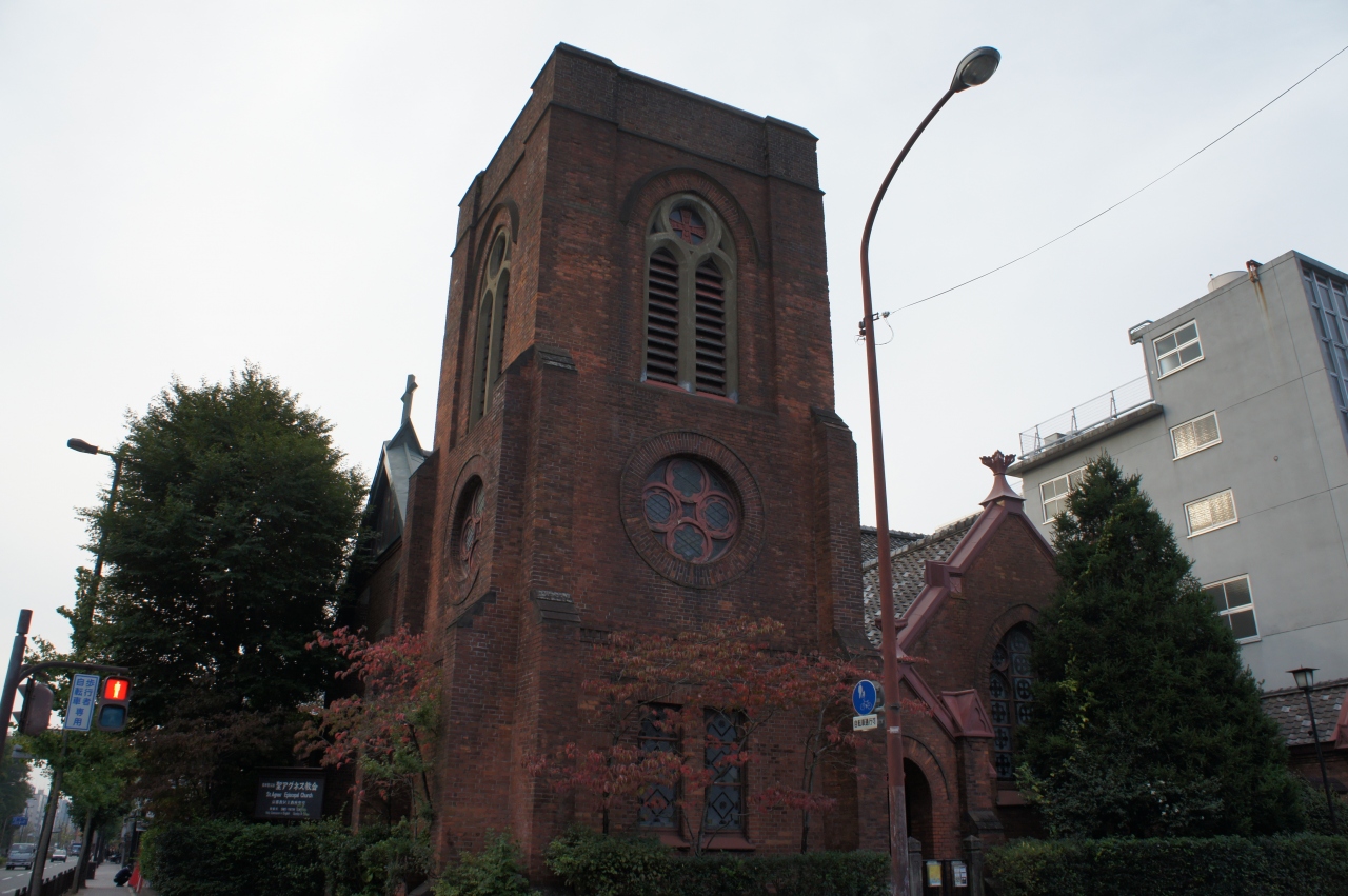 日本聖公会 聖アグネス教会は、京都御苑の西側。明治31年に平安女学院のチャペルとして建てられたもの。ゴシック様式でレンガ造りの建物は、初代校長ジェームズ・ガーディナーによる設計。歴史を経てでしょうが、赤いレンガが渋い色合いになっています。