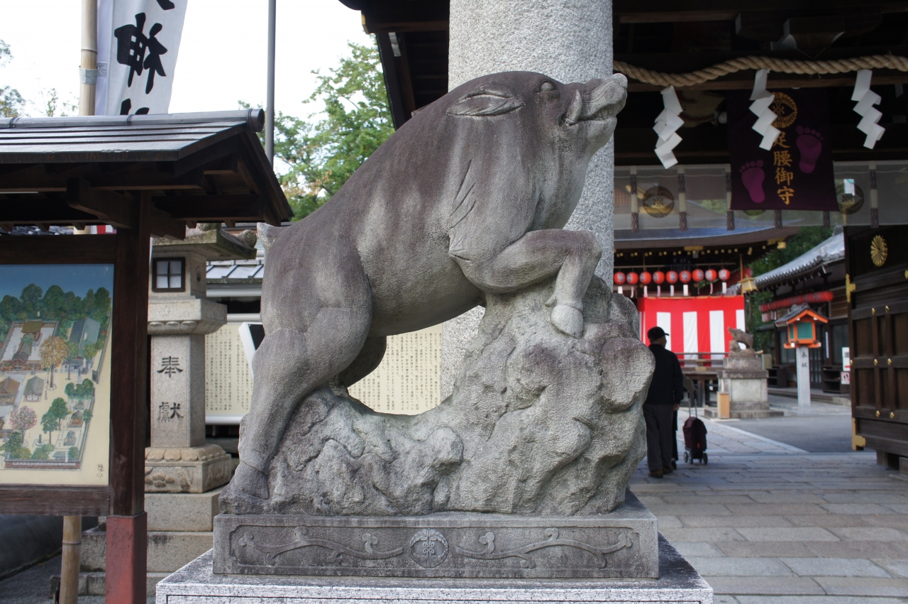 護王神社は、和気清麻呂と姉の和気広虫が主祭神。和気清麻呂が宇佐へ流された際、道鏡が送った刺客に襲われ、この時、300頭の猪によって命を救われたという伝説から、境内は至る所に猪。狛犬もあ・うんの猪となっていました。