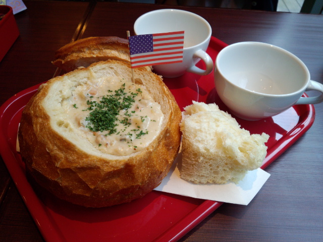 温かく丸いフランスパンをくりぬき中には大量具沢山のクラムチャウダーが入ってます。