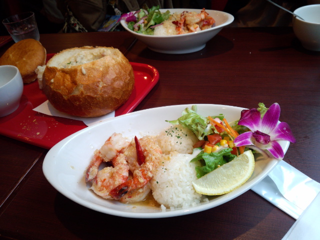 選んだのはガーリックシュリンプのシンプル(海老6尾、ライス)とパンに入ったクラムチャウダーこちらもシンプルをオーダー。