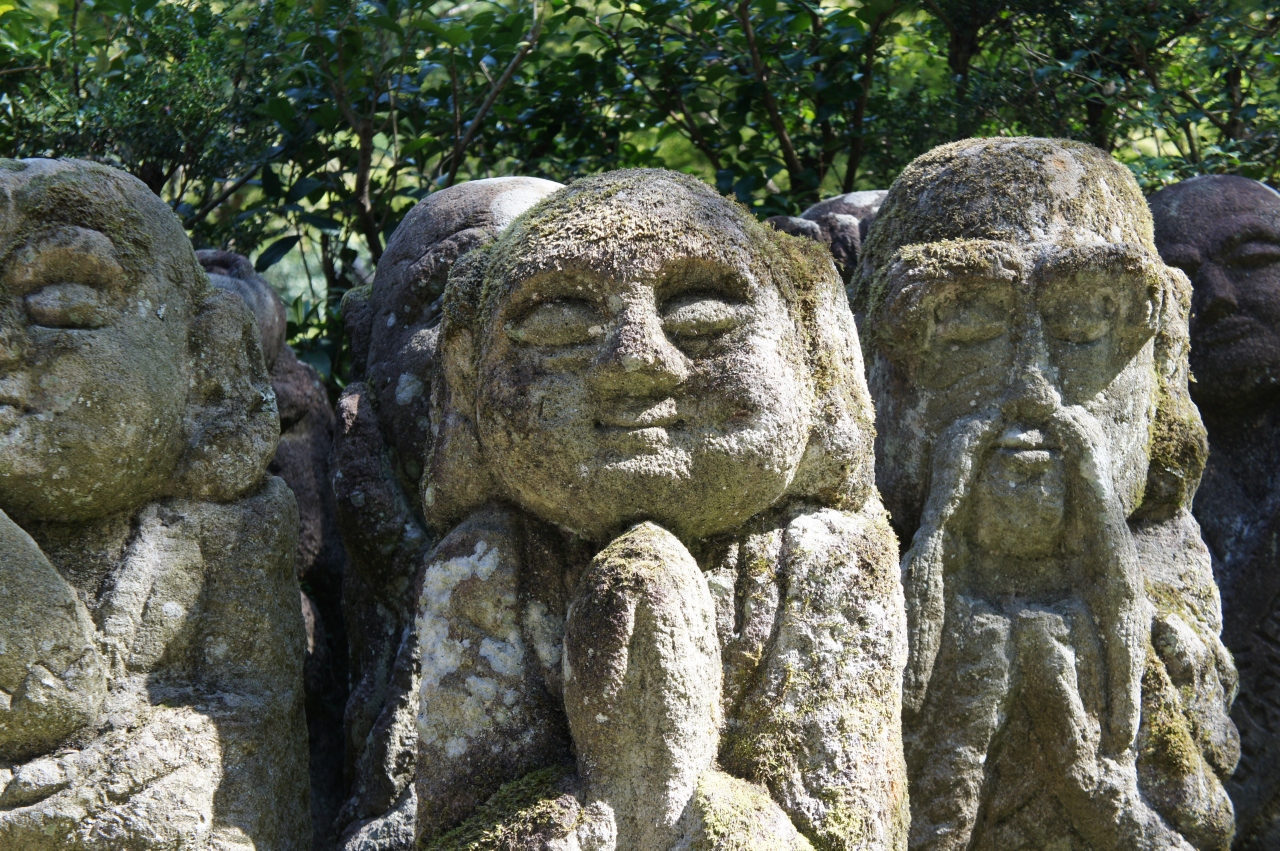山門から先、境内に、裏山まで含めて、お地蔵さんのような石仏がいっぱいです。そういえば、昔来た時は、まだこんな石仏には目が行かなかったかもしれませんね。で、改めて一つ一つの石仏の表情を見たりしていると、苔むした素朴な中にも、かわいいのやら、ひょうきんなのやらも混じっています。それでも、それぞれに思いがこもっていることを考えると、この数の膨大さのすごい意味が分かるような気がしました。