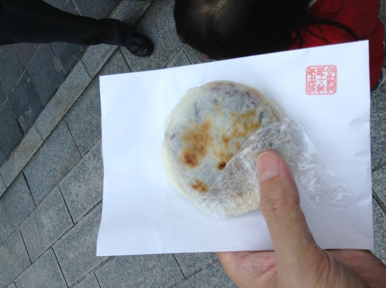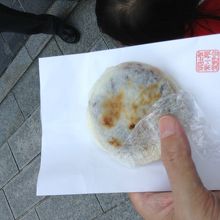店頭の貼り紙に、北海道十勝産小豆を使用とあり、他店にはないアピールなので、梅ヶ枝餅一個105円を購入。ちなみに梅ヶ枝餅を参道はどこでも105円です。