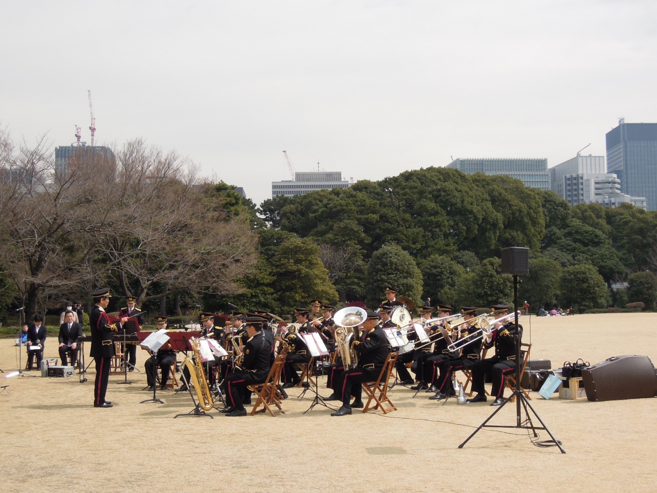 紅葉もいいですが、梅や桜の時期の東御苑が好きです。とても綺麗に手入れされていて、特に梅が素晴らしく綺麗です。最近ではアジアの団体客を見かけます。みなさんこぞって桜と記念撮影をしています。騒々しいのが困りますが…。今回行ったのは3月22日。東御苑本丸前の芝生で、皇宮警察音楽隊がランチタイムコンサートをするので、30分という短い時間ではありますがそれにあわせて散策しました。「夜明けのスキャット」や「歩いて行こう」など、日本人なら誰でも知っている曲目でした。アンコール、なんかにも(事前準備してあるので)応えてくれますし、若い音楽隊員の方のトークの頑張りも微笑ましいです。