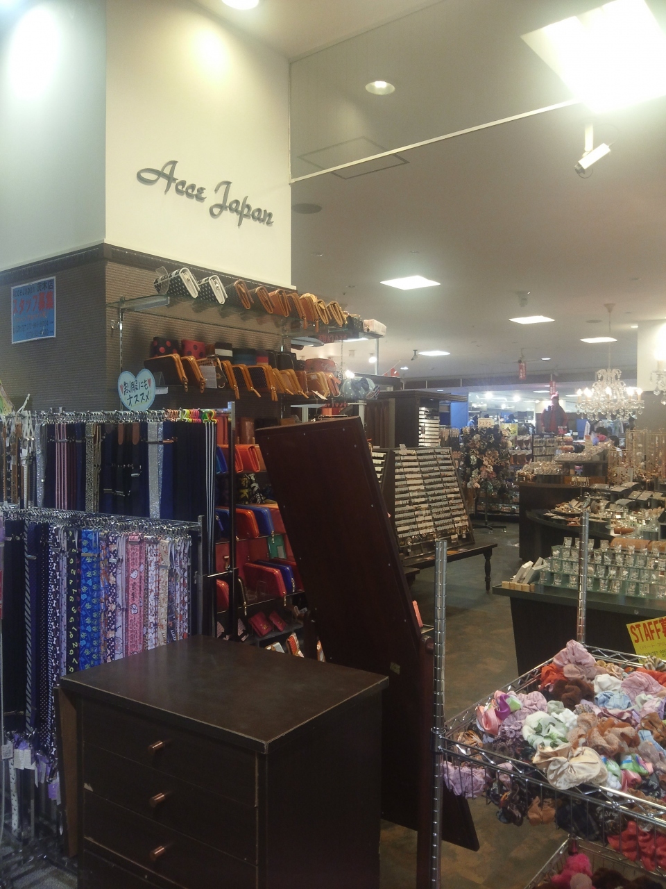 アクセサリー専門店のアクセジャパンです。ショップは結構大きく、ペアーに付けるクシやシュシュなどのほかイヤリング、バンダナや財布などの小物始め色んなアクセサリーが揃っています。カジュアルからエレガントな物まで揃っています。