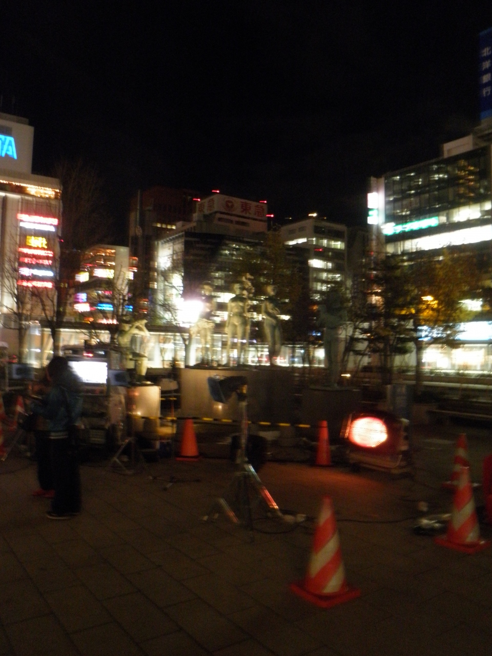 札幌に初雪が降った夜、札幌駅の南口広場を散策してみました。 広い割には照明が少ないので、薄暗い感じですが何かのイベントの準備をしていました。 牧歌の像の他にも、背の高い柱や弧の形をしたオブジェなどが配置されているのですが、一体感がなくて目立たないような気がします。